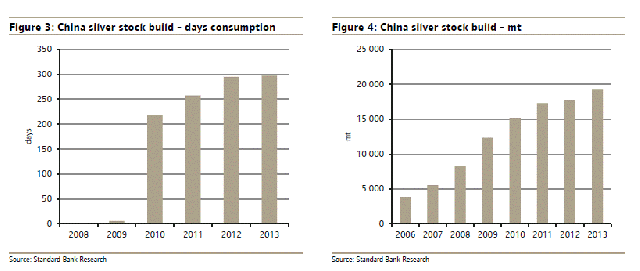まず第一に2010年から2012年に輸入された大量のシルバーにより、まだ国内には相当大量のシルバー在庫があると考えられます。我々の推測では300日分の国内での消費量、4000トン以上のシルバーがあるはずです。(Figure 3 & Figure 4)