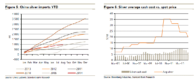 二番目、それもシルバーに対する消極的見方になるのですが、これまでの中国のシルバー輸入は我々の期待よりも弱いものであったということ。2014年のスタートではその輸入のペースはよかったのですが、その後ペースは落ち、今後も少なくとも年末までの間それが回復するとは思えません。(Figure 5)このスローダウンは、弱まった投資需要と産業需要の伸びの減少そして国内の在庫によるものです。