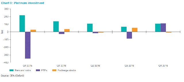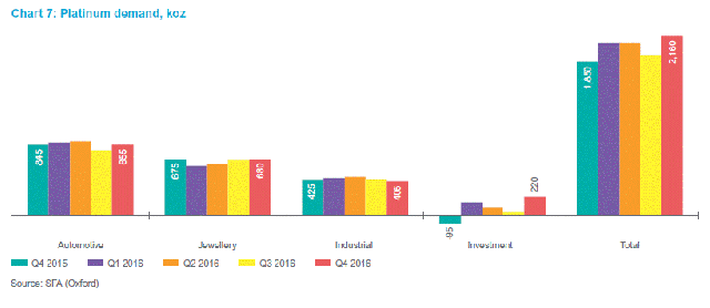 日本の投資家のプラチナ地金の買いは2016年の最初の3四半期は減りつつあったが、Q4でプラチナ価格が下がったことから、Q4では再び需要が盛り上がり、コイン需要も刺激し110k tozとなった。